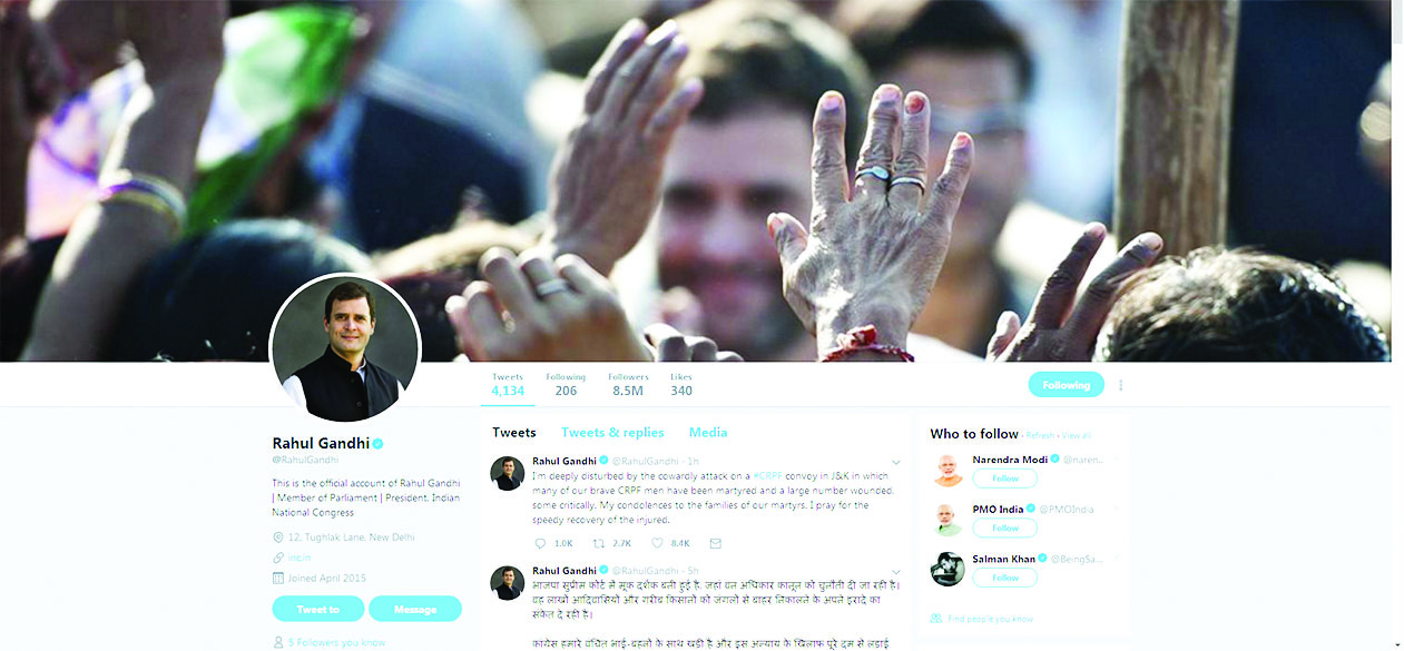 ഒരു വർഷം മുമ്പ് ആഗോള രാഷ്ട്രീയക്കാരിൽ ഏറ്റവുമധികം സോഷ്യൽ മീഡിയാ പിന്തുണയുള്ളയാളായിരുന്നു മോഡി. നാലരക്കോടി പേർ അദ്ദേഹത്തെ ട്വിറ്ററിൽ ഫോളോ ചെയ്തു. അമേരിക്കൻ പ്രസിഡന്റ് ഡോണൾഡ് ട്രംപ് മാത്രമായിരുന്നു മുന്നിൽ. അതേസമയം രാഹുൽ ഗാന്ധിക്ക് 84.2 ലക്ഷം ഫോളോവേഴ്സേ ഉള്ളൂ. മാധ്യമ പ്രവർത്തകരായ ബർഖാ ദത്തിനും രാജ്ദീപ് സർദേശായിക്കും പോലും ഏതാണ്ട് ഇത്രയും ഫോളേവേഴ്സുണ്ട്. എന്നാൽ രാഹുലിന് ട്വീറ്റുകൾ ഇപ്പോൾ വജ്രായുധമാണ്. ആളുകൾ അവ ശ്രദ്ധിച്ചു തുടങ്ങിയിരിക്കുന്നുവെന്ന് ബി.ജെ.പി പോലും സമ്മതിക്കും. ആളുകൾ ഇപ്പോൾ രാഹുലുമായി കൂടുതൽ സംവാദത്തിന് തയാറാകുന്നുവെന്ന് എ.ഐ.സി.സി കമ്യൂണിക്കേഷൻസ് കൺവീനർ പ്രിയങ്ക ചതുർവേദി അഭിപ്രായപ്പെട്ടു.