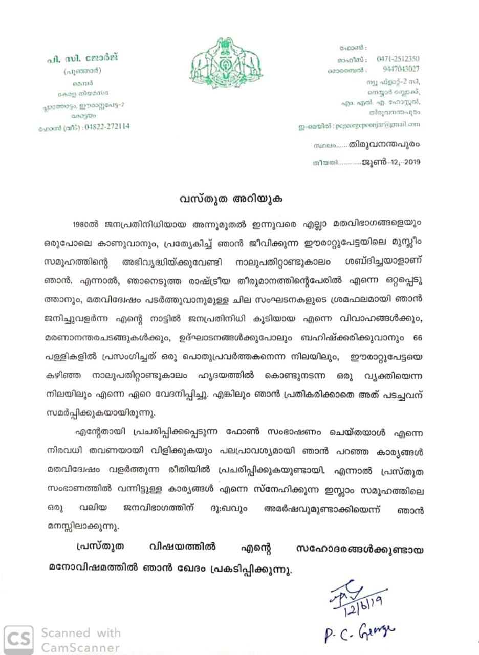 നാലു പതിറ്റാണ്ടുകാലമായി ഈരാറ്റുപേട്ടക്കും മുസ്ലിം സഹോദരങ്ങൾക്കും വേണ്ടി പ്രവർത്തിച്ചുകൊണ്ടിരിക്കുന്ന തന്നെ രാഷ്ട്രീയ തീരുമാനത്തിന്റെ പേരിൽ ഒറ്റപ്പെടുത്തുകയും കല്യാണങ്ങൾ ഉൾപ്പെടെയുള്ള പരിപാടികളിൽനിന്ന് ബഹിഷ്കരിക്കുകയാണെന്നും ഇതിൽ വേദനയുണ്ടെന്നും പി.സി. ജോർജ് ഫെയ്സ് ബുക്ക് പോസ്റ്റിലൂടെ പുറത്തിറക്കിയ പ്രസ്താവനയിൽ പറയുന്നു. തന്നെ ഫോൺ ചെയ്തയാൾ നിരവധി തവണ വിളിക്കുകയും പിന്നീട് പറഞ്ഞ കാര്യങ്ങൾ മത വിദ്വേഷം വളർത്തുന്ന രീതിയിൽ പ്രചരിപ്പിക്കുകയുമായിരുന്നു. ഈ സംഭാഷണത്തിൽ പറഞ്ഞ കാര്യങ്ങൾ ഇസ്ലാം സമൂഹത്തിലെ വലിയ ജനവിഭാഗത്തിന് ദുഃഖവും അമർഷവുമുണ്ടാക്കിയെന്നും മനസ്സിലാക്കുകയും മനോവിഷമത്തിൽ ഖേദം പ്രകടിപ്പിക്കുകയും ചെയ്യുന്നതായി പത്രക്കുറിപ്പിൽ പറഞ്ഞു.
