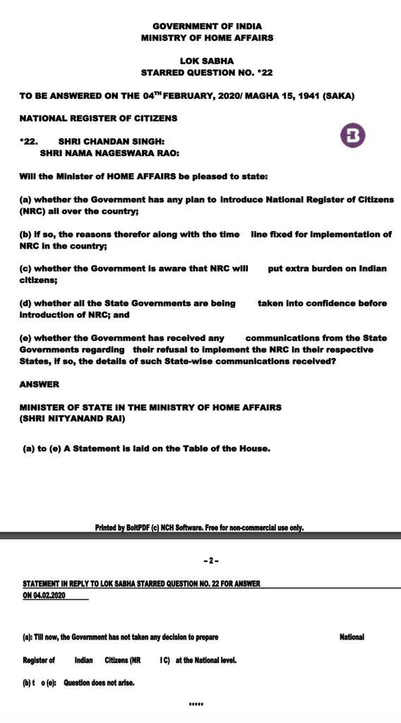 ദേശീയ തലത്തിൽ എൻ.ആർ.സി നടപ്പാക്കാൻ കേന്ദ്ര സർക്കാറിന് പദ്ധതിയുണ്ടോ എന്ന ചോദ്യത്തിന് കേന്ദ്ര ആഭ്യന്തര സഹമന്ത്രി നിത്യാനന്ദ് റായ് ആണ് മറുപടി നൽകിയത്. നിലവിൽ എൻആർസി അസമിൽ മാത്രമാണു നടപ്പാക്കിയത്. അതുകൊണ്ടു മറ്റു ചോദ്യങ്ങൾക്കു പ്രസക്തിയില്ലെന്നും മറുപടിയിൽ പറയുന്നു.