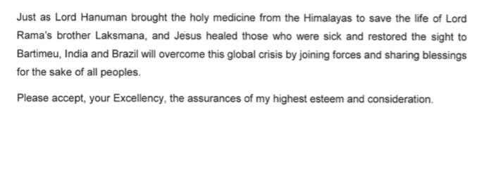 ബ്രസീൽ പ്രസിഡന്റ് ജെയിർ ബോൽസാനാരോ കത്തയച്ചു. 'ശ്രീരാമന്റെ സഹോദരൻ ലക്ഷ്മണന്റെ ജീവൻ രക്ഷിക്കാനായി ഹനുമാൻ ഹിമാലയത്തിൽനിന്ന് വിശുദ്ധ മരുന്ന് കൊണ്ട് വന്നത് പോലെ, രോഗികൾക്ക് യേശു ക്രിസ്തു കാഴ്ച ശക്തി പുനഃസ്ഥാപിച്ചത് പോലെ, ഇന്ത്യയും ബ്രസീലും ഒരുമിച്ച് ഈ ആഗോള പ്രതിസന്ധി മറികടക്കുമെന്നാണ് ബ്രസീൽ പ്രസിഡന്റ് അയച്ച കത്തിലെ വാചകം. കഴിഞ്ഞ ദിവസം മരുന്ന് ലഭ്യമാക്കണമെന്നാവശ്യപ്പെട്ട് അമേരിക്കൻ പ്രസിഡന്റ്് ഡോണൾഡ് ട്രംപ് ഭീഷണി മുഴക്കിയിരുന്നു. മരുന്ന് ലഭ്യമാക്കിയില്ലെങ്കിൽ കനത്ത തിരിച്ചടി നേരിടേണ്ടി വരുമെന്നായിരുന്നു അമേരിക്കയുടെ മുന്നറിയിപ്പ്. ഏതാനും മണിക്കൂറുകൾക്കകം തന്നെ അമേരിക്കയിലേക്ക് മരുന്ന് കയറ്റി അയക്കാമെന്ന് ഇന്ത്യ സമ്മതിക്കുകയും ചെയ്തു. അമേരിക്കയിലേക്ക് ഗുജറാത്തിൽനിന്നാണ് മരുന്ന് കയറ്റുമതി ചെയ്യുന്നത്.