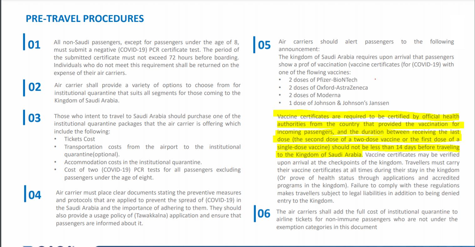 ഫൈസർ ബയോൻടെക്, ഒക്സ്ഫോർഡ് ആസ്ട്രസെനിക്ക കോവിഷീൽഡ്, മോഡേർണ ഇവയിലേതെങ്കിലുമൊന്നിന്റെ രണ്ട് ഡോസ്, ജോൺസൻ ആന്റ് ജോൺസൻ വാക്സിന്റെ ഒരു ഡോസ് എന്നിവയെടുത്തവർക്ക് മാത്രമാണ് സൗദിയിലെത്തിയ ശേഷമുള്ള ഇൻസ്റ്റിറ്റിയൂഷനൽ ക്വാറന്റൈനിൽ ഇളവുള്ളത്. മറ്റേതെങ്കിലും വാക്സിൻ സ്വീകരിച്ചവരും രണ്ട് ഡോസിൽ ഒരു ഡോസ് എടുത്തവരും ക്വാറന്റൈൻ പരിധിയിൽ വരും. വാക്സിനെടുത്ത് 14 ദിവസം പൂർത്തിയായ ശേഷമേ യാത്ര ചെയ്യാവൂ.