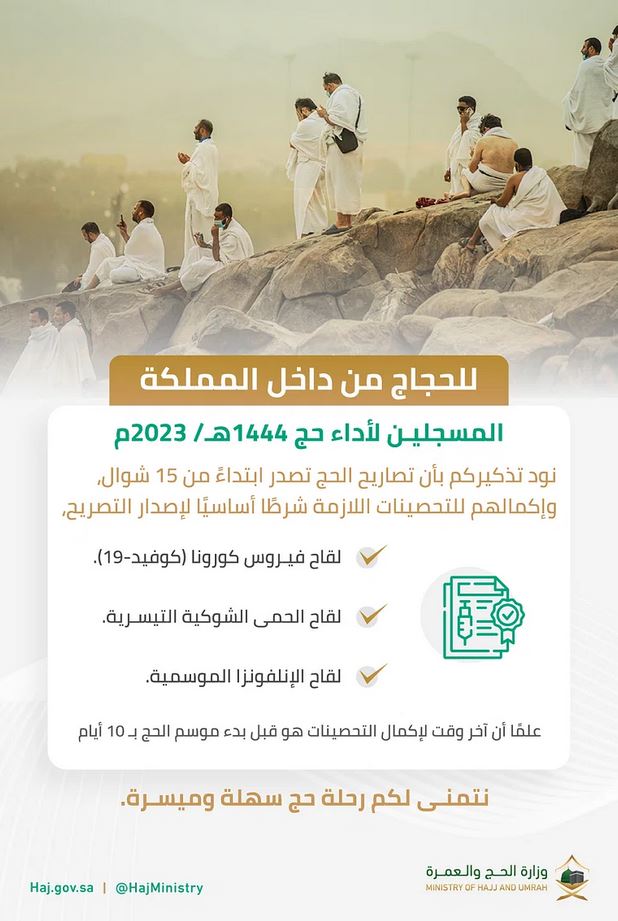 മക്ക- പ്രതിരോധ വാക്സിനുകള് യഥാസമയം സ്വീകരിച്ചവര്ക്ക് ഹജ് പെര്മിറ്റ് അനുവദിക്കുന്നത് ശവ്വാല് 15 ന് തുടങ്ങുമെന്ന് ഹജ് മന്ത്രാലയം അറിയിച്ചു.